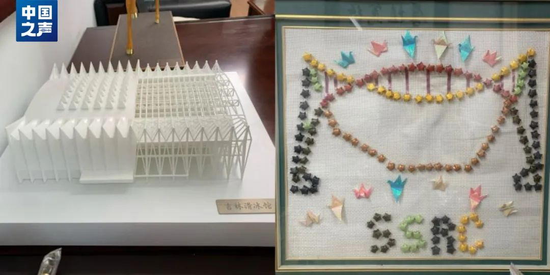 沈世釗的辦公室,一幅手工作品被放在門口最顯眼的位置,那是學(xué)生送給他的禮物。千紙鶴和紙星星拼貼成的雙向拋物線造型圖,定格了回國后的沈世釗在新領(lǐng)域白手起家的開端:參與吉林省滑冰館的設(shè)計。