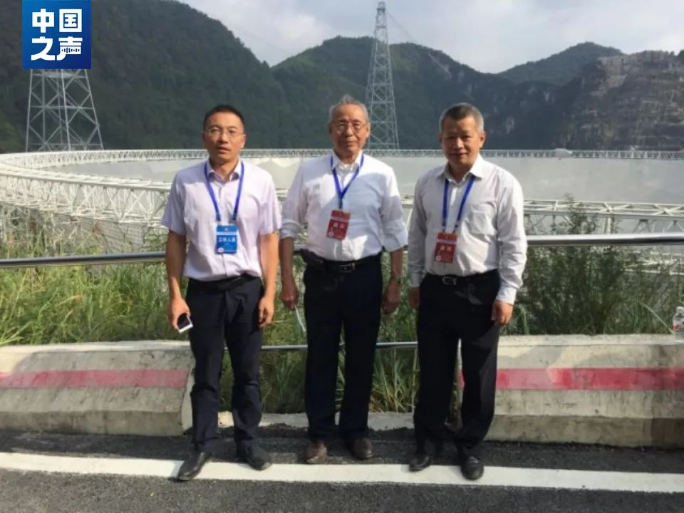 圖:沈世釗(中)和團隊成員在落成的“中國天眼”前