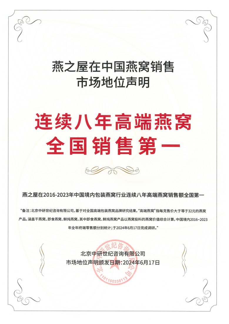 燕之屋26年專注高品質燕窩,秉承“一碗好燕窩,滋潤天下人”的初衷,致力于為消費者提供更健康、更營養(yǎng)、更美味、更便捷的燕窩滋養(yǎng),以卓越品質塑造良好口碑。2019年,燕之屋正式入駐阿里健康大藥房,借助阿里健康平臺龐大用戶基礎及數(shù)字化能力,精準定位消費群體,拓寬營銷渠道,更好地滿足消費者的多元滋養(yǎng)需求,深度鏈接健康產業(yè)市場。截至2023年,燕之屋已連續(xù)八年高端燕窩全國銷售第一*(*燕之屋在2016-2023年中國境內包裝燕窩行業(yè)連續(xù)八年高端燕窩銷售額全國第一,備注:北京中研世紀咨詢有限公司,基于對全國高端包裝燕窩品牌研究結果,“高端燕窩”指每克售價大于32元的燕窩產品,涵蓋干燕窩、即食燕窩、鮮燉燕窩,其中即食燕窩、鮮燉燕窩產品以燕窩投料的燕窩價值綜合計算,中國境內2016-2023年全年終端零售額分別統(tǒng)計;于2024年6月17日完成調研),并于港交所成功上市(股票代碼:01497.HK),其不僅是燕窩行業(yè)“領頭燕”,也是健康產業(yè)的一匹黑馬,奮勇前進,勢不可擋,展現(xiàn)蓬勃力量。