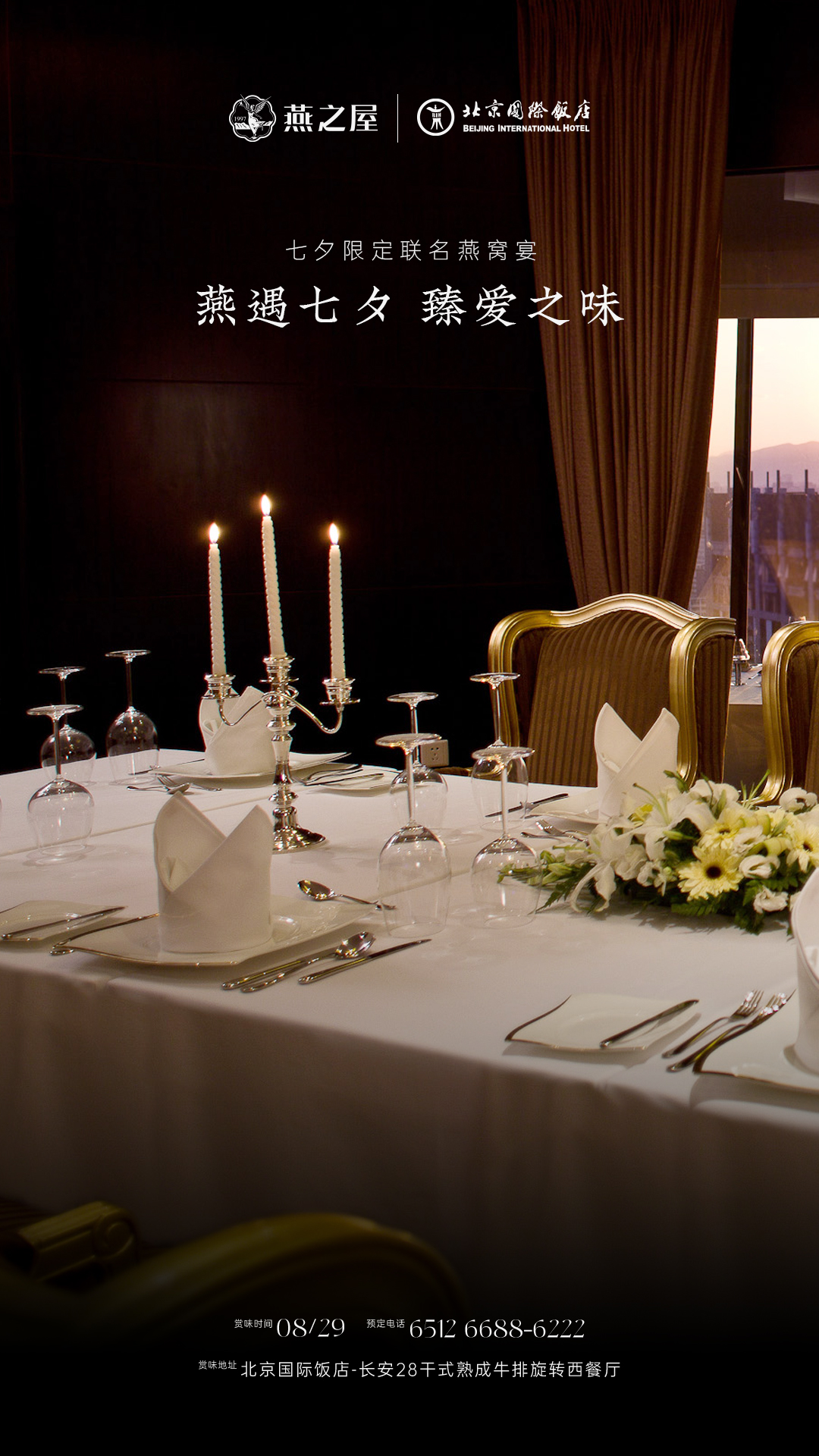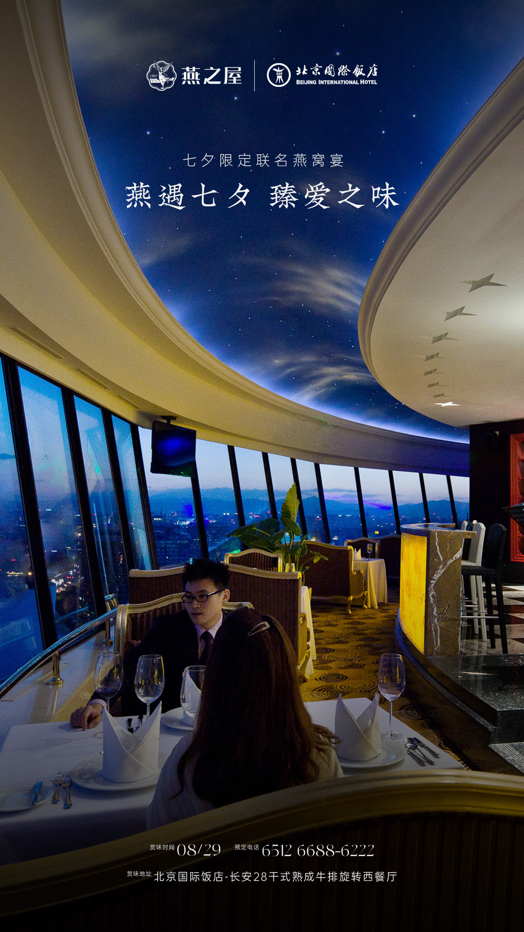 北京國際飯店長安28餐廳作為北京市中心高空360度環(huán)瞰京城盛景的旋轉(zhuǎn)餐廳,以其獨(dú)特的奢華與雅致并存的裝修風(fēng)格,成為京城高端餐飲場所。604㎡餐廳空間、100個精致餐位,3間多功能廳房,配合專業(yè)的服務(wù)團(tuán)隊,為每位賓客提供尊貴的用餐體驗。燕之屋27年專注高品質(zhì)燕窩,始終堅持“源于天然,美與健康”的理念,以創(chuàng)新科研賦能上乘品質(zhì),連續(xù)九年高端燕窩全國銷售第一①。此次合作是云端視野與輕奢品味的雙重尊享,正如每一對相約七夕的甜蜜愛侶。