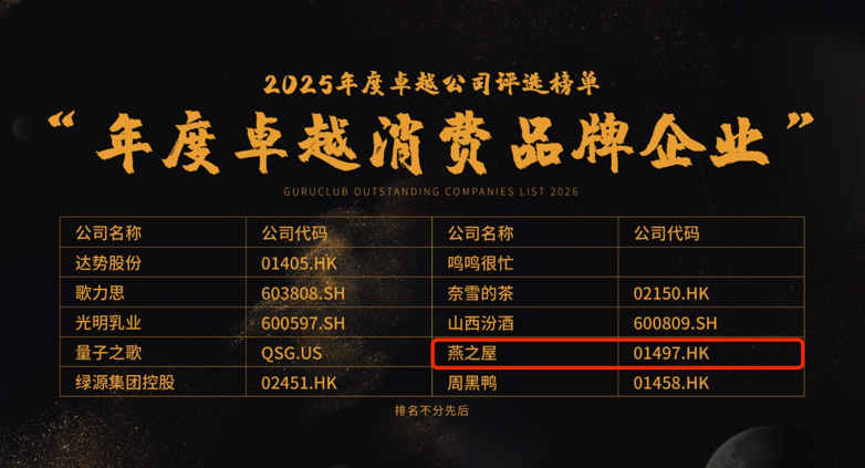格隆匯以“全球視野,下注中國”為初衷,打造出投資圈中具參考價值的上市公司及獨角獸公司排行榜,評選覆蓋全球多家主流交易所的上市公司及獨角獸企業(yè)。2025年度卓越公司評選榜單——“年度卓越消費品牌企業(yè)”獎項旨在表彰在消費復蘇背景下表現(xiàn)突出的優(yōu)秀企業(yè),該獎項從品牌知名度、行業(yè)影響力、增長潛力等多個維度進行綜合評估,嚴格甄選出那些在高質(zhì)量發(fā)展道路上展現(xiàn)韌性、勇于創(chuàng)新的企業(yè)。燕之屋憑借企業(yè)深厚實力登上該榜單。